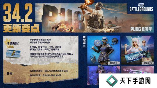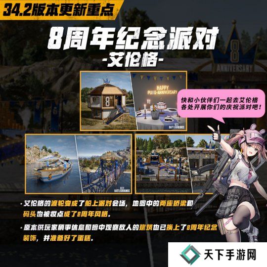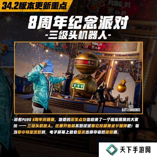 本次更新为游戏营造了更加浓厚的周年庆典氛围。所有地图的出生岛新增巨型 3 级头机器人,玩家还能投掷特别加入的黄金手榴弹。跳伞前,天空将被绚烂烟花点亮,而艾伦格地图中的定期船只变身为游轮派对场地。此外,两座大桥及码头区域焕新升级,以 8 周年主题装饰,带来更具沉浸感的游戏体验。