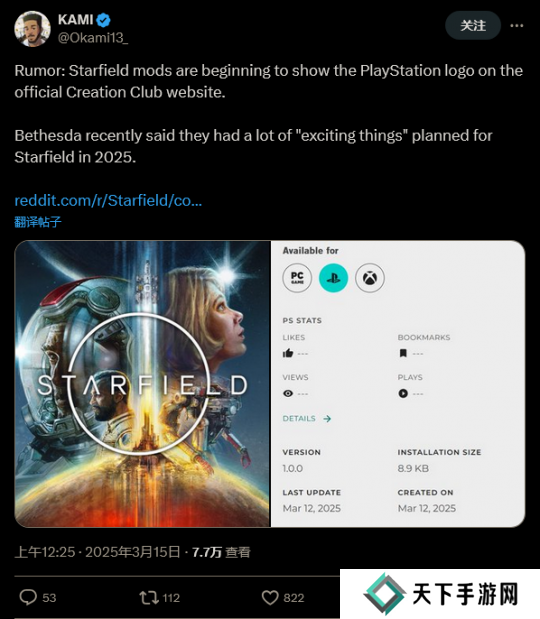 出现标志的是《星空》创作俱乐部网站。这是 B 社官方提供 Mod 的网站,近期的一个 Mod 封面上显示了 PlayStation、Xbox 和 PC 的商标。这些标志旨在显示 Mod 在哪些平台上可以使用,这暗示 Mod 将能够在 PS5 主机上使用。