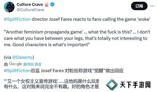 对于《双影奇境》被批评是woke游戏,创意总监Josef Fares回应说:“又一个女权主义宣传游戏’……这他妈是什么玩意?……我不在乎你两腿之间有什么,那对我来说完全不重要。好的角色才是关键。”
