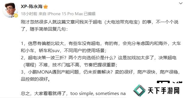 对此,小鹏汽车副总裁陈永海表示,(报道)信息有偏差比较大,会充分考虑国内和海外;决策超电(增程)不难,技术门槛不高,节奏把握很重要。此外,他还提到小鹏 MONA 卖的很好,爬产很快,爬产很稳,品控做的很好。