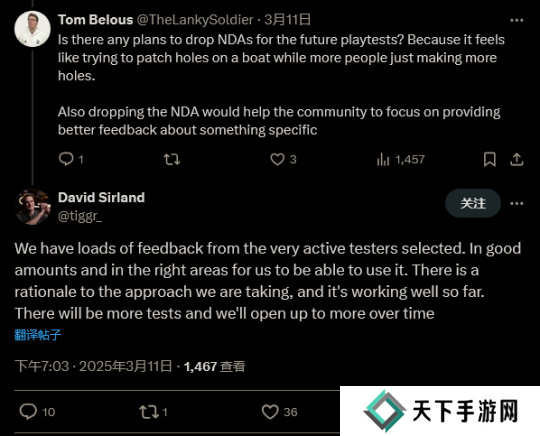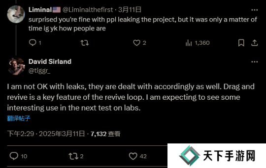 当一位玩家在 Sirland 的社交媒体帖子下表达了对开发者默许测试内容泄露的惊讶后,Sirland 写道:“我并不接受泄密,它们也会到相应的处理。”