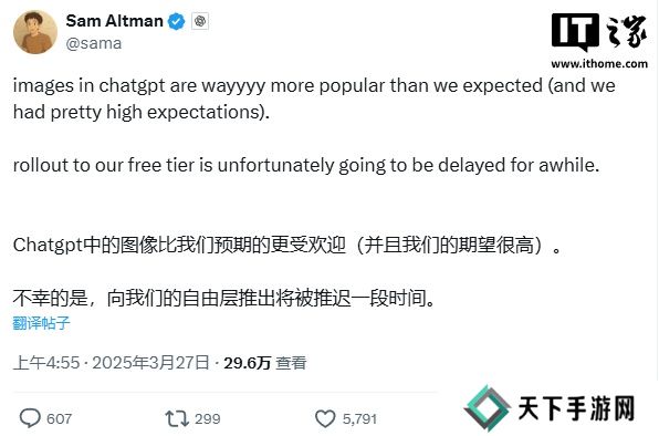 本站 3 月 27 日消息,OpenAI 首席执行官萨姆奥尔特曼(Sam Altman)今天在 X 上承认,ChatGPT 中图像生成工具的受欢迎程度远超预期,所以免费版用户的上线计划将不得不推迟一段时间。