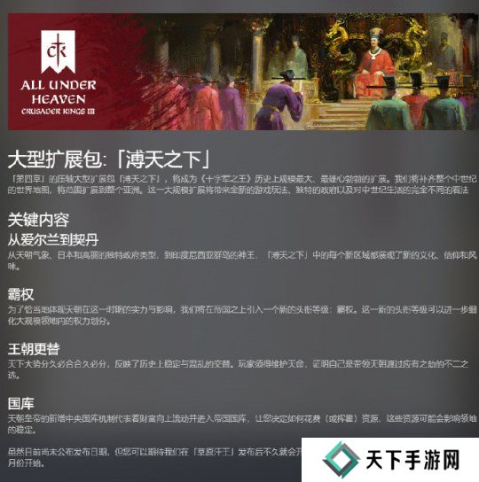 近日,战争策略游戏《十字军之王3》正式公开了第四个大型DLC扩展包“All Under Heaven”(溥天之下),预计将于今年年底推出。