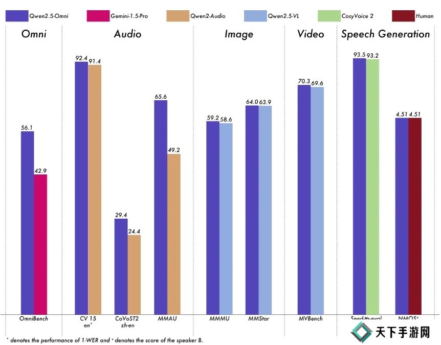 在多模态任务 OmniBench,Qwen2.5-Omni 达到了 SOTA 的表现。此外,在单模态任务中,Qwen2.5-Omni 在多个领域中表现优异,包括语音识别(Common Voice)、翻译(CoVoST2)、音频理解(MMAU)、图像推理(MMMU、MMStar)、视频理解(MVBench)以及语音生成(Seed-tts-eval 和主观自然听感)。