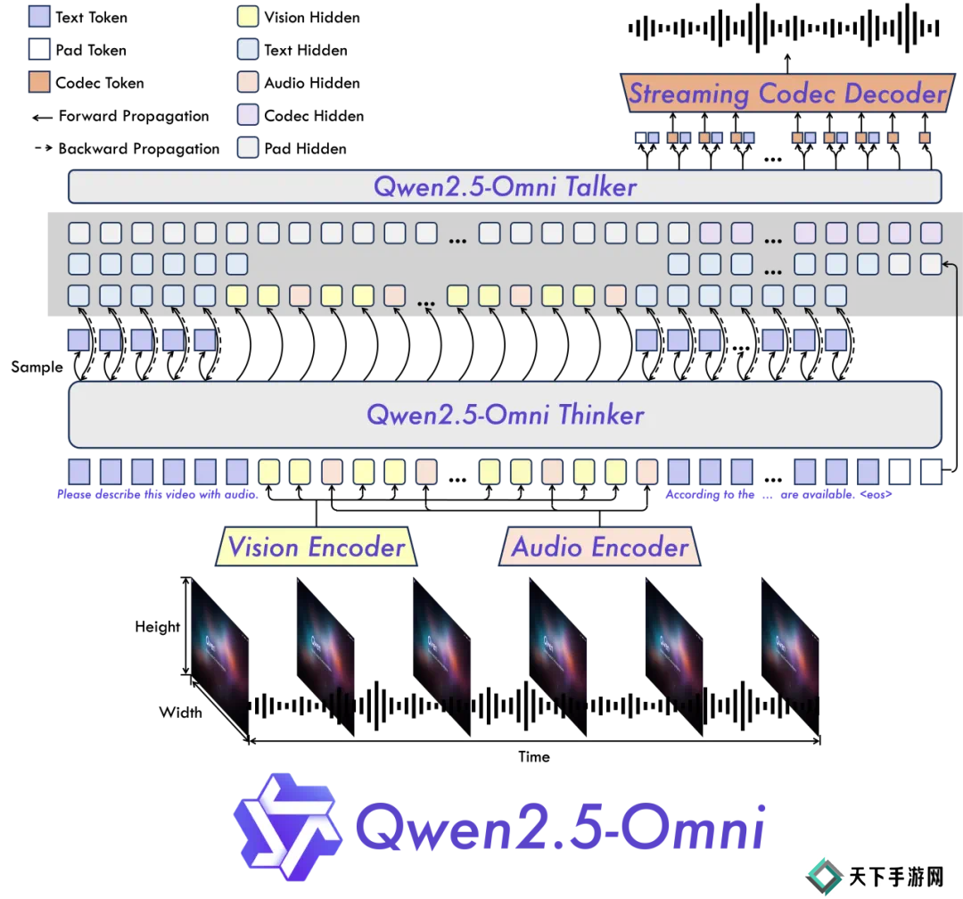 全能创新架构:Qwen 团队提出了一种全新的 Thinker-Talker 架构,这是一种端到端的多模态模型,旨在支持文本 / 图像 / 音频 / 视频的跨模态理解,同时以流式方式生成文本和自然语音响应。Qwen 提出了一种新的位置编码技术,称为 TMRoPE(Time-aligned Multimodal RoPE),通过时间轴对齐实现视频与音频输入的精准同步。