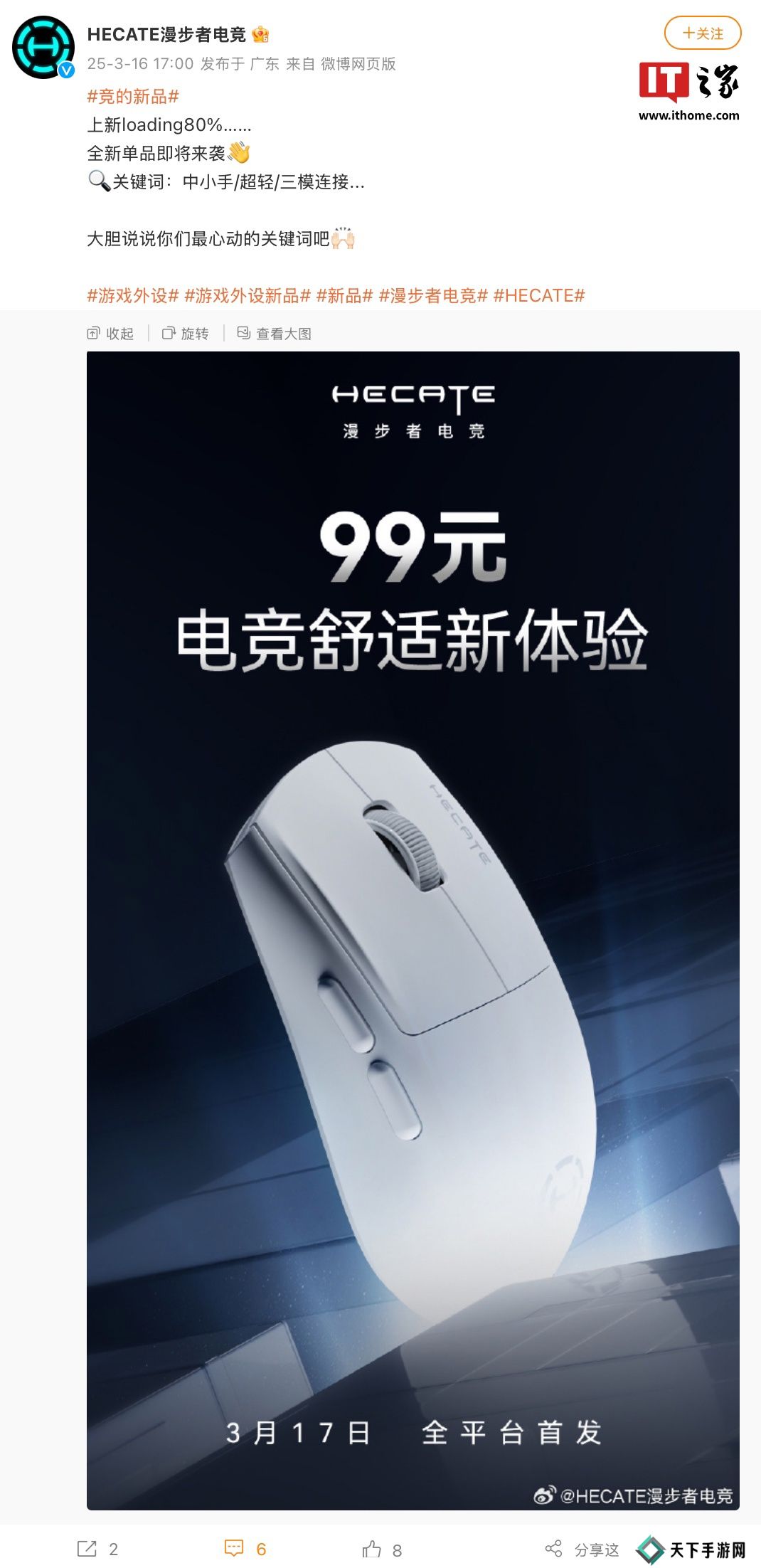 本站 3 月 16 日消息,漫步者 HECATE 电竞品牌宣布将在明天推出一款定价 99 元的入门级鼠标,相应鼠标适用于中小手形,支持三模连接,强调重量表现,不过官方没有透露更多信息,目前电商平台也未上架。