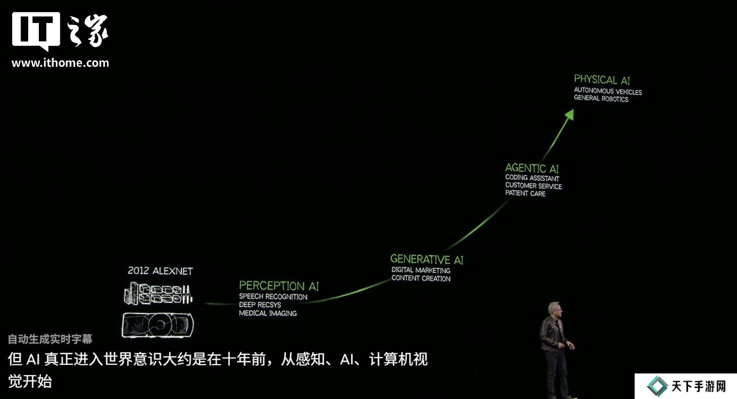 黄仁勋一上来就提到了 AI 发展的未来,现在我们处于生成式 AI(Generative AI)阶段,但根据黄仁勋的路线图,我们将迈向一个代理式 AI(Agentic AI)时代,随后是物理 AI(Physical AI)—— 机器人登场的时候。