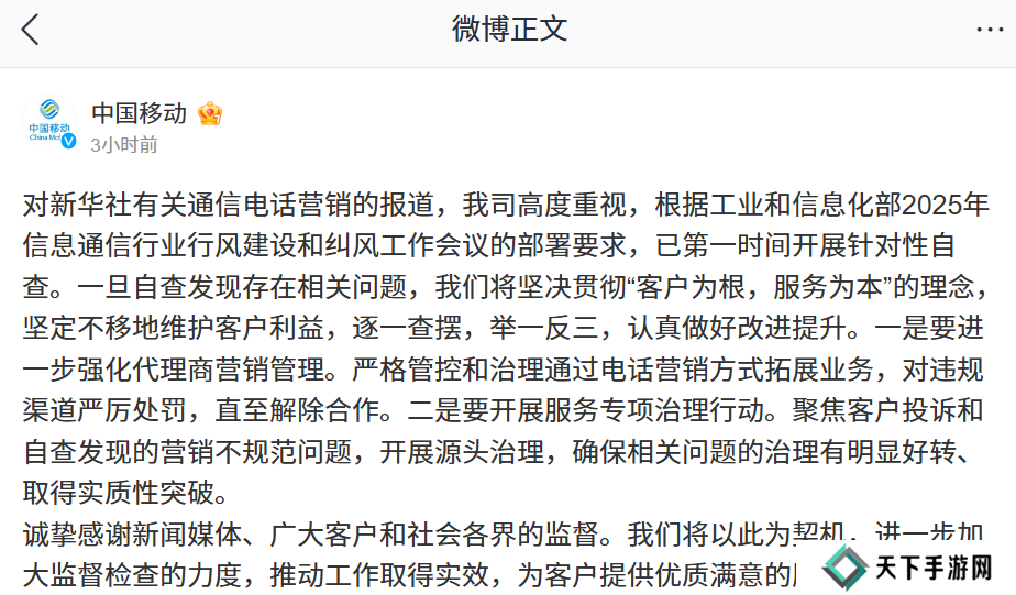 对新华社有关通信电话营销的报道,我司高度重视,根据工业和信息化部 2025 年信息通信行业行风建设和纠风工作会议的部署要求,已开展全面自查,对于发现的问题,将坚决迅速整治。并持续强化营销服务规范,加强对一线人员的培训及对代理商的管理监督,严肃惩处不规范行为,切实维护用户合法权益。