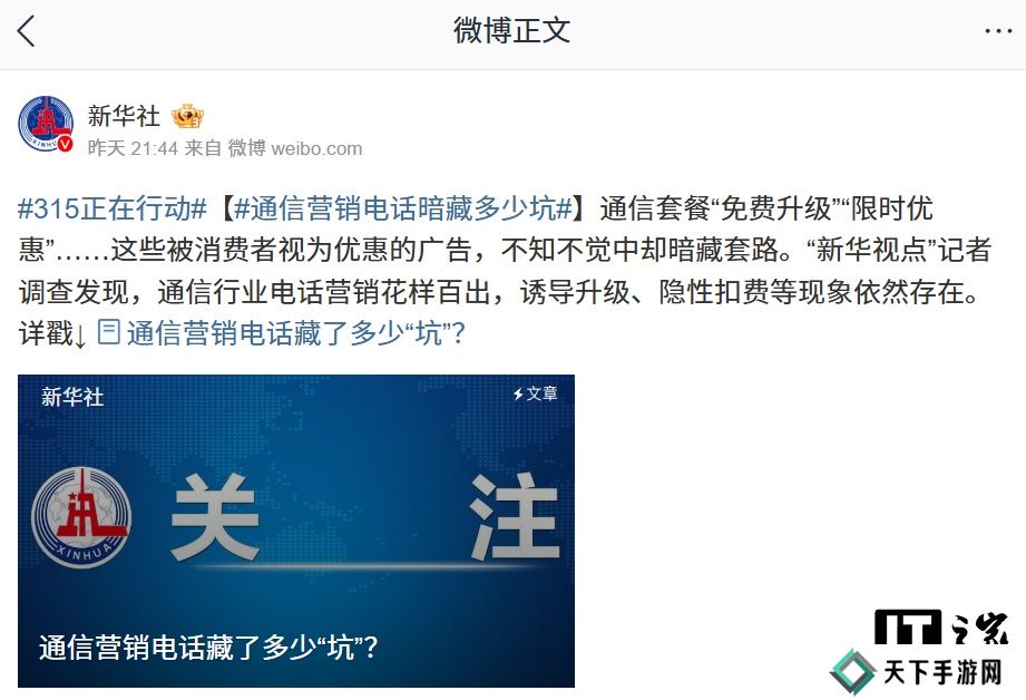 本站 3 月 16 日消息,据新华社昨日晚报道,当前通信营销电话花样百出,诱导升级、隐性扣费等现象依然存在,运营商推销人员在推销电话中以免费试用、免费升级、免费赠送为幌子,故意隐藏或模糊最低消费、合约期限、自动续费、违约金等关键信息,诱导消费者开通付费业务等不正当营销问题突出。