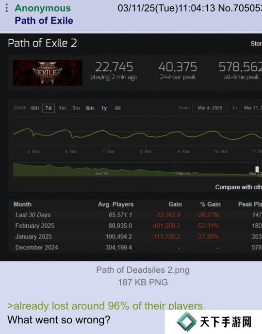 近日,网友发现去年12月初首发火爆异常的暗黑类动作RPG《流放之路2》,在线率暴跌,Steam在线峰值从三个月前的57.8万人降到了24小时峰值3.8万人左右,人员流失了超过93%。