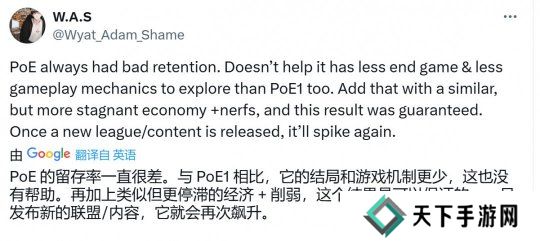 也有玩家指出,《流放之路》的留存率本来就很差,和1代游戏相比,2代目前处于抢先体验付费阶段,终局内容更少,玩法机制也少。再加上类似但更停滞的经济+职业平衡削弱,这个结果是必然的。一旦发布新的内容,在线率就会再次飙升。
