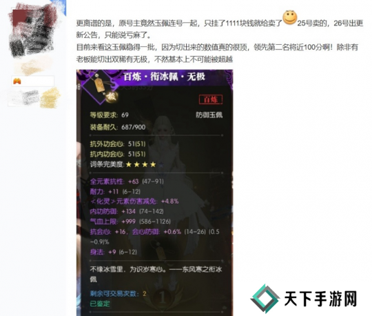25日大晚上,这位嗜战斗成瘾的副本发烧友,因为手里账号打本CD用完了,但还想刷高难副本,就登上账号交易平台“藏宝阁”选号。最终花费1111元拿下看中的账号,原以为只是副本佬的随心之举,结果就是这么一个看似平平无奇的账号,玉佩部位评分拉到了全服最顶,甚至还比第二名遥遥领先100分。