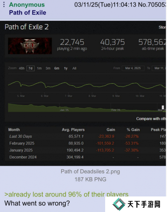 来到本月,《流放之路2》的在线玩家玩家人数仅剩4万左右,不及巅峰时期的十分之一。超过90%的玩家,离开了这款游戏。