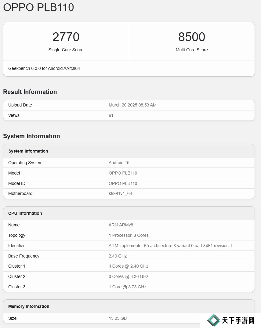 OPPO Find X8S+ 配备 16GB 内存,运行安卓 15 系统,6.3.0 版本单核成绩为 2770 分,多核成绩为 8500 分。