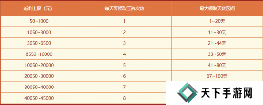 玩家的返还上限为5000元(50万元宝),按活动设定:每天可领取工资次数上限3次,总计有100次工资领取次数;开服后A第一天充值300元,获得了3次工资领取资格,当天可领取7500元宝(2500元宝*3);3次领取完毕,剩余工资次数为0;若该玩家7天后又充值了1000元,可再获得10次领取工资资格,(受每日领取次数限制)第一天可领取3次,剩余领取次数为7次,总计需要分4天完成领取。