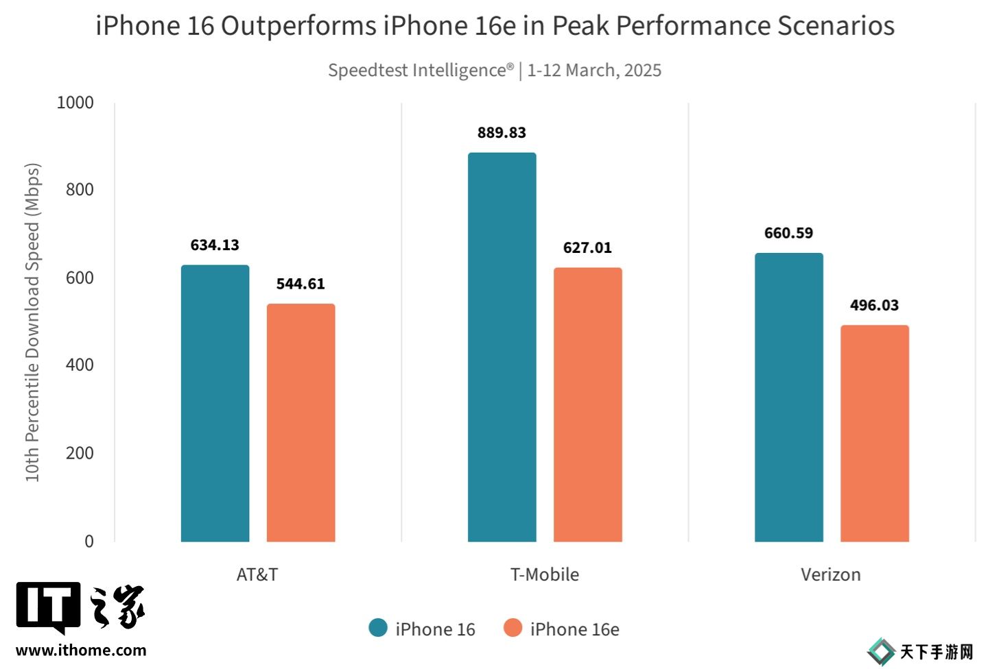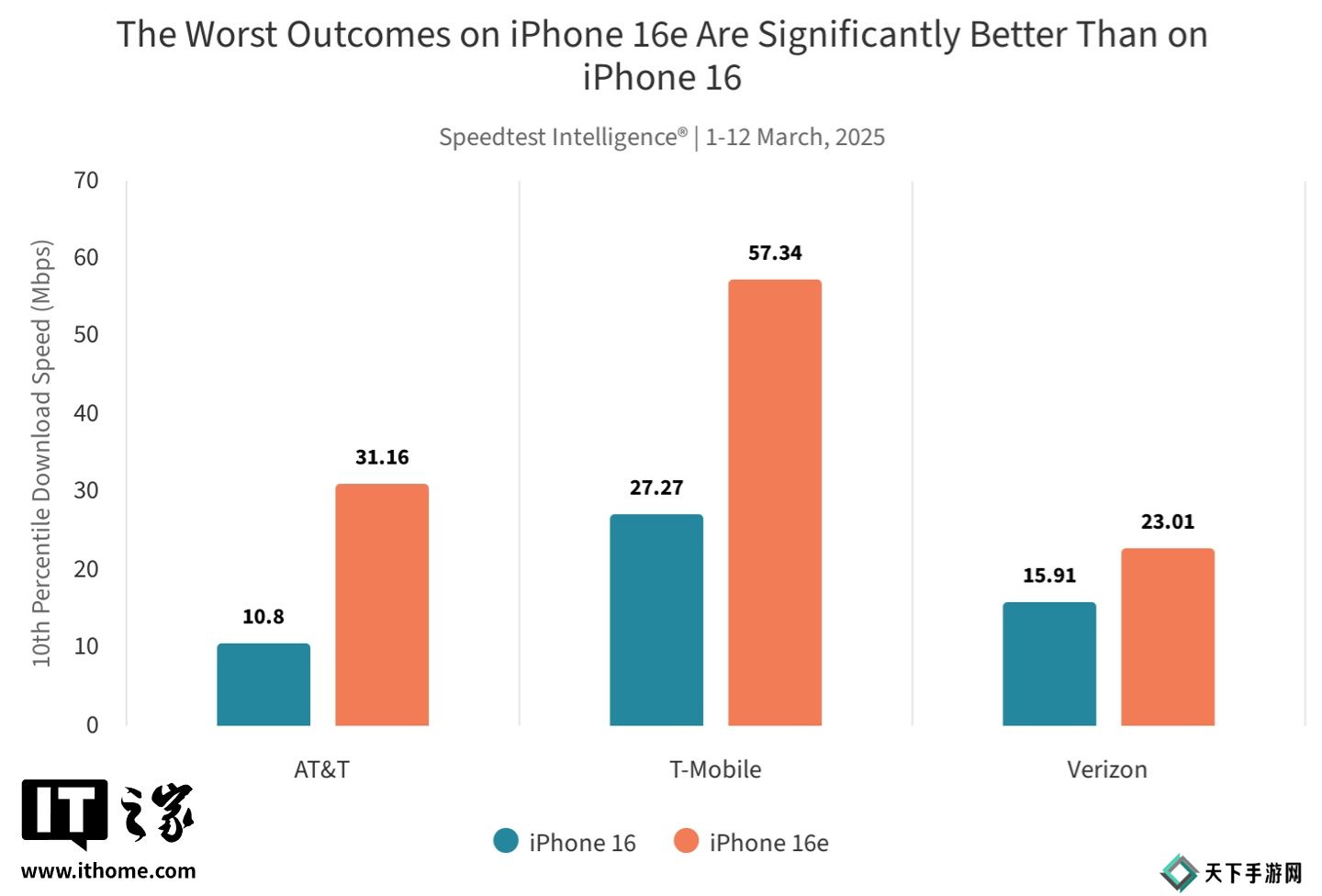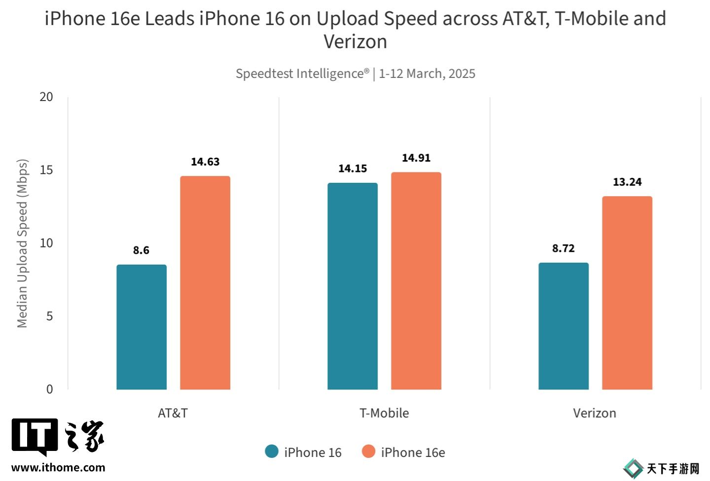 根据 Ookla 昨晚发布的最新 Speedtest(2025 年 3 月 1 日至 12 日)测试报告,iPhone 16e 在美国三大运营商网络环境下表现不一,在 AT&T 和 Verizon 网络下的中位下载速度略优于 iPhone 16,但在 T-Mobile 网络下表现明显落后。
