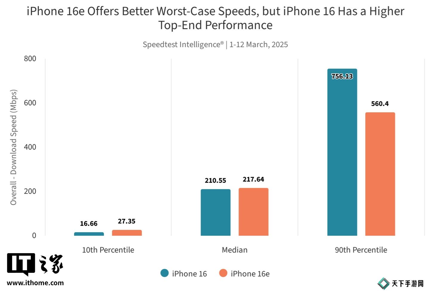 值得注意的是,在下载速度最低的 10% 用户数据中,iPhone 16e 的表现明显优于 iPhone 16。