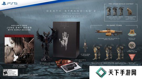 预购“数字豪华版”或“典藏版”的玩家,可以提前2天游玩,即在6月24日即可开始体验。典藏版包含15英寸麦哲伦人雕像、玩偶人雕像、艺术卡、小岛秀夫的一封信和一些游戏内物品,售价229.99美元。标准版售价69.99美元,数字豪华版售价79.99美元。