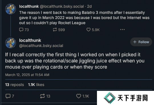 在社交媒体上,他透露该项目在 2021 年 12 月开始后,在 2022 年 3 月曾放弃开发,直到他断网无事可做才重新开始制作。他写道:“我在 2022 年 3 月基本上放弃了《小丑牌》3 个月后又重新开始制作它,原因是我很无聊,但是网断了,导致我没法玩《火箭联盟》。”