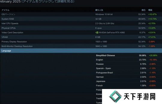 V社最近发布了最新一期(2025年2月)Steam硬件与软件调查。根据数据,2025年2月,该平台上的中文用户数量月增幅达到了20.88%,导致中文用户在该月的总占比上升到50.06%,作为对比,2025年2月英语用户的占比为23.79%,2025年1月中文用户比例为29.18%。