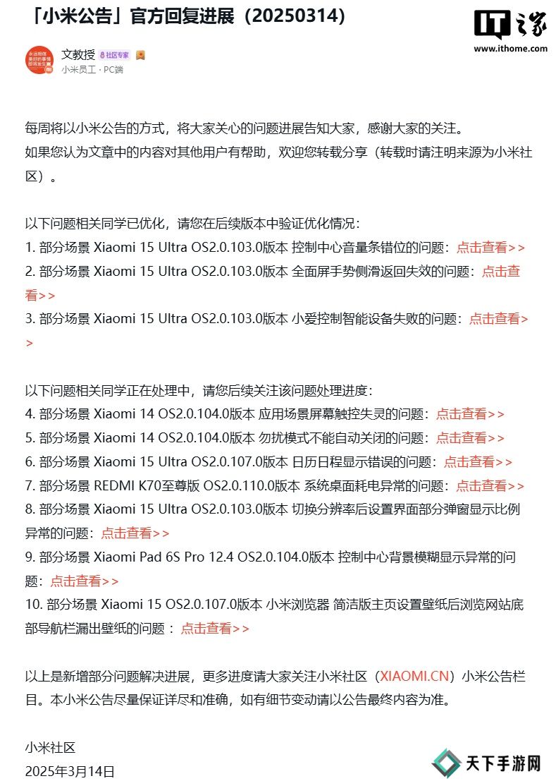 本站 3 月 16 日消息,小米官方本周(3 月 14 日)在小米社区发布公告,对小米澎湃 OS 问题处理进展进行公布,其中提到了小米 15 Ultra 手机的体验问题优化情况(澎湃 HyperOS OS 2.0.103.0 版本)。