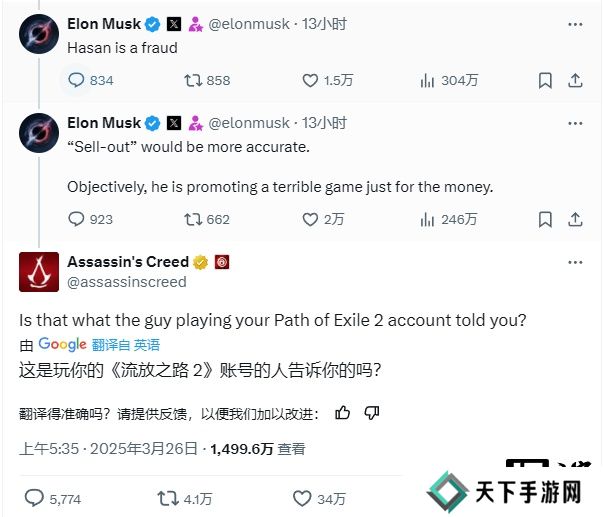 正是马斯克这句关于“糟糕游戏”的评论,引来了《刺客信条》官方 X 账号的直接回应。该账号并没有直接为游戏辩护,而是简洁而尖锐地反问道:“这是那个帮你玩《流放之路 2》(Path of Exile 2)账号的人告诉你的吗?”
