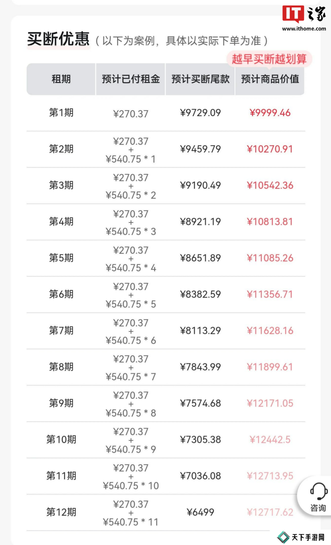 一年期满后,可以买断手机,价格为 6499 元,租金 + 买断共计达到 12700 元。