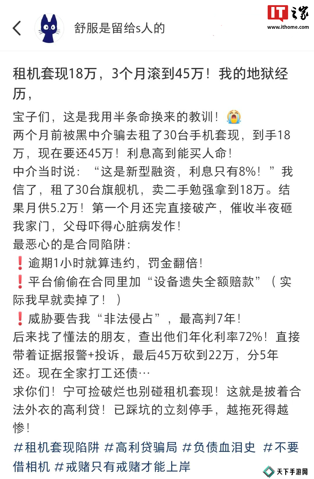 3 月 9 日,有网友在社交平台发文分享了自己的租机贷经历,按照该网友的说法,他被黑中介骗去租了 30 台手机套现,到手 18 万,结果要还 45 万。
