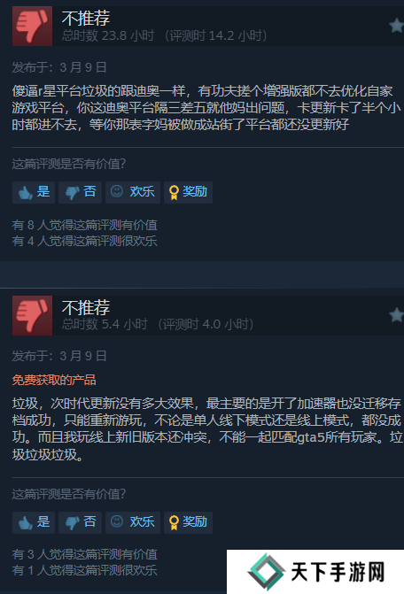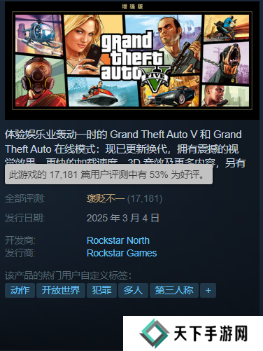 目前在Steam平台,《GTA5》PC次世代版本(官方名称《GTA5 增强版》),仅仅只有53%的好评率,为系列最低。这项数据,甚至不如此前外包团队开发的《GTA三部曲》。