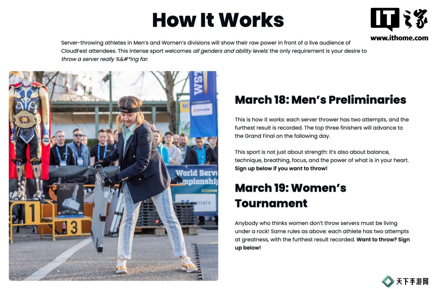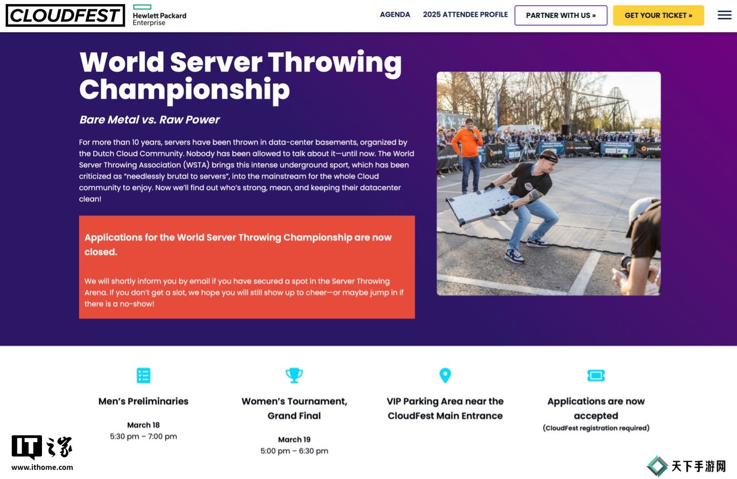 本站 3 月 18 日消息,号称“全球排行第一的互联网基础设施盛会”CloudFest 2025 活动将于北京时间明天在德国举办,当天也将举行一年一度的“世界服务器投掷锦标赛(WSTC)”,也就是“看谁扔服务器最远”。