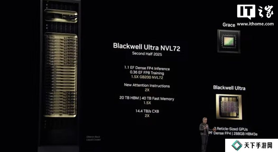 本站 3 月 19 日消息,在今日凌晨的英伟达 GTC 2025 大会上,英伟达 CEO 黄仁勋发布了 Blackwell Ultra NVL72 平台,该平台将于 2025 年下半年推出,具有两倍的带宽和 1.5 倍更快的内存。