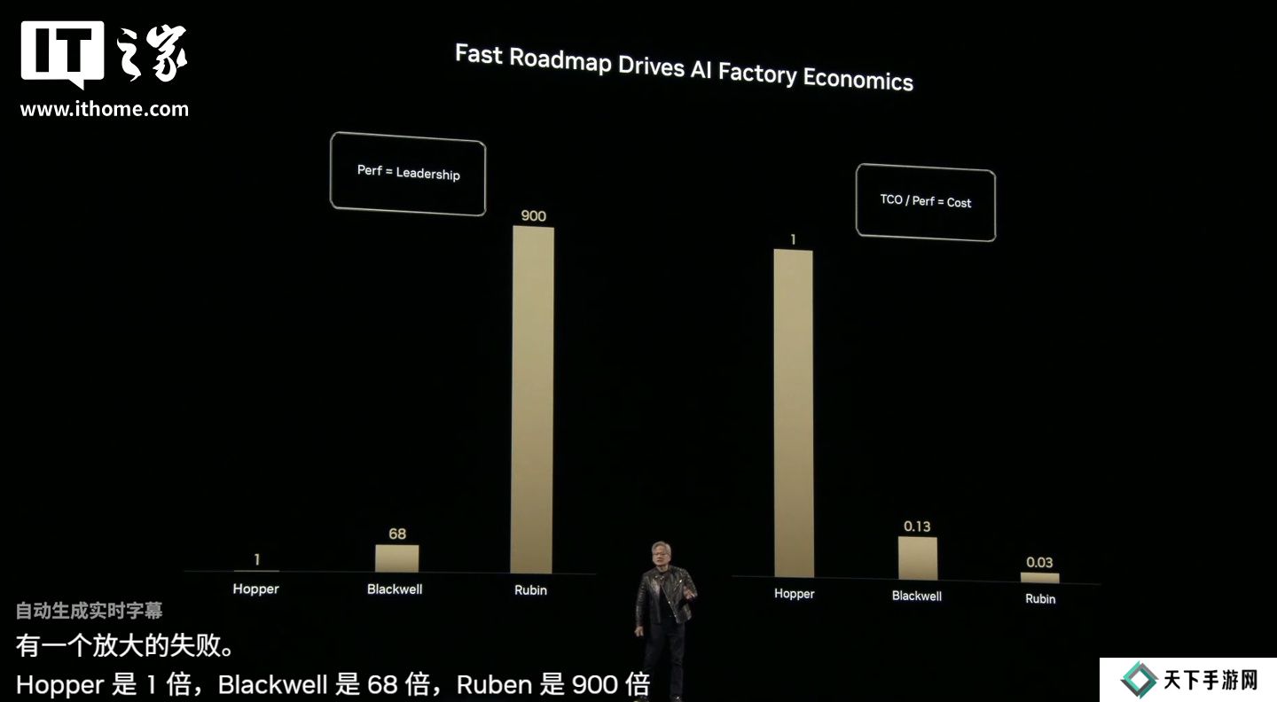 黄仁勋展示了 Rubin 系统的参数,并宣称Rubin 的性能可达Hopper 的 900 倍,而 Blackwell 是 Hopper 的 68 倍。