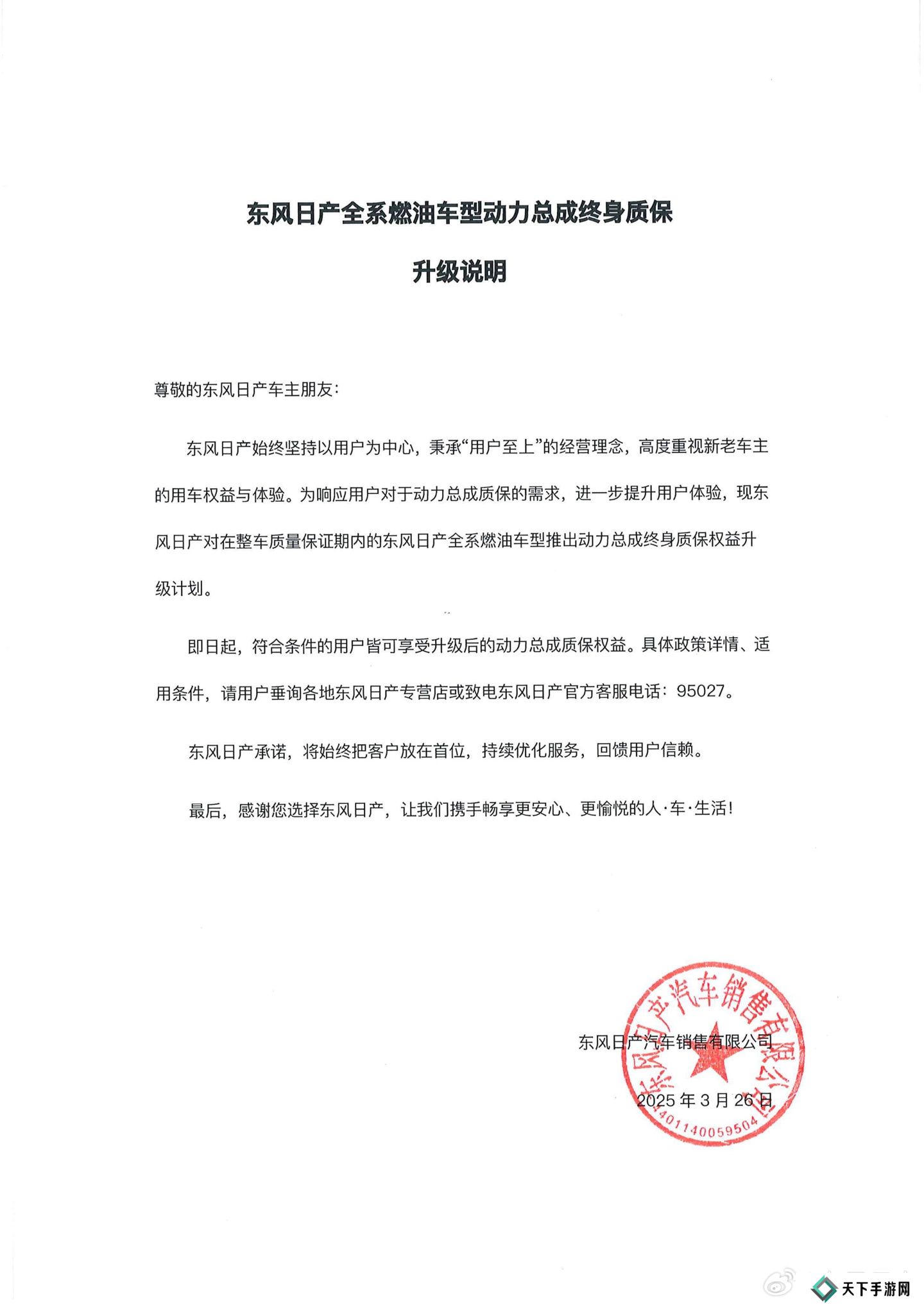 本站 3 月 27 日消息,东风日产官方微博昨日晚发布升级说明,宣布东风日产全系燃油车型动力总成升级终身质保。