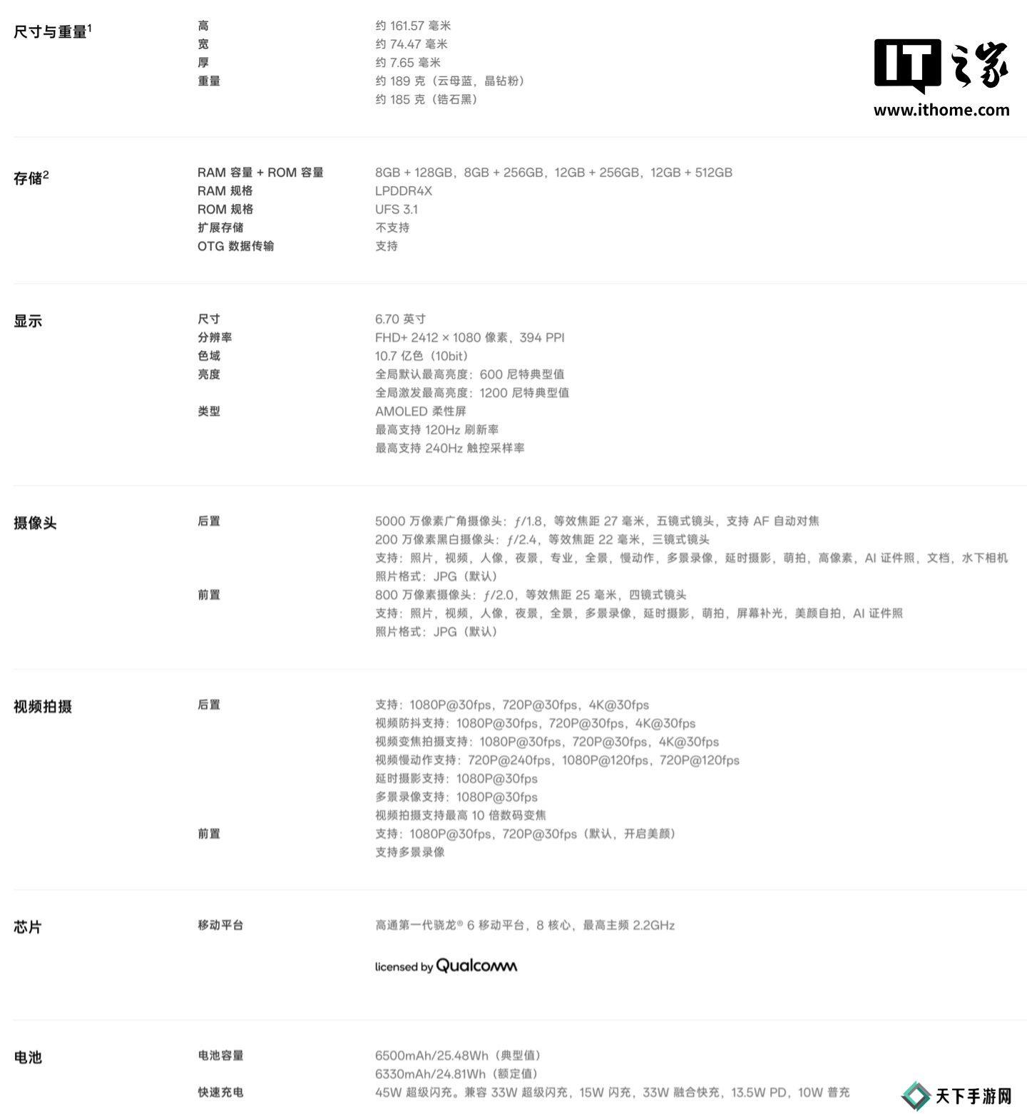 规格方面,该机使用骁龙6 Gen 1处理器,搭载LPDDR4X RAM和 UFS 3.1存储,内置6500mAh电池(支持45W超级闪充),支持 NFC。