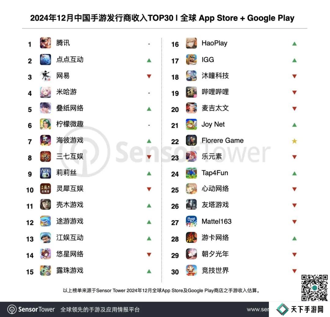 2024年12月中国手游发行商全球收入排行榜显示了全球范围内中国手游发行商的收入情况。